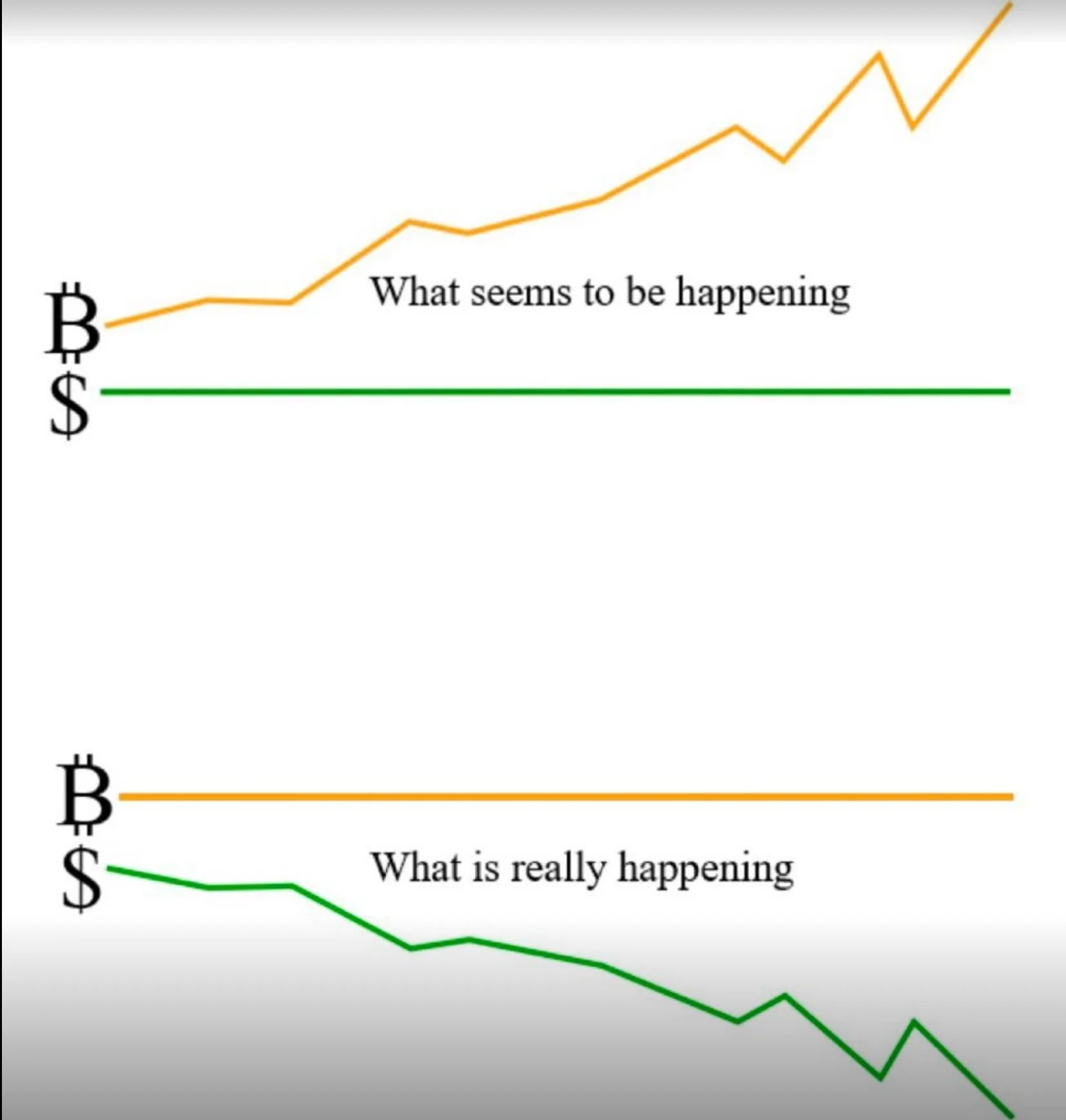 The Truth Found In Volatility - The illustration shows what has happened with inflation vs Bitcoin over time. This is for educational purposes only and is not financial advice. All forms of money carry risk — some obvious, some hidden.
